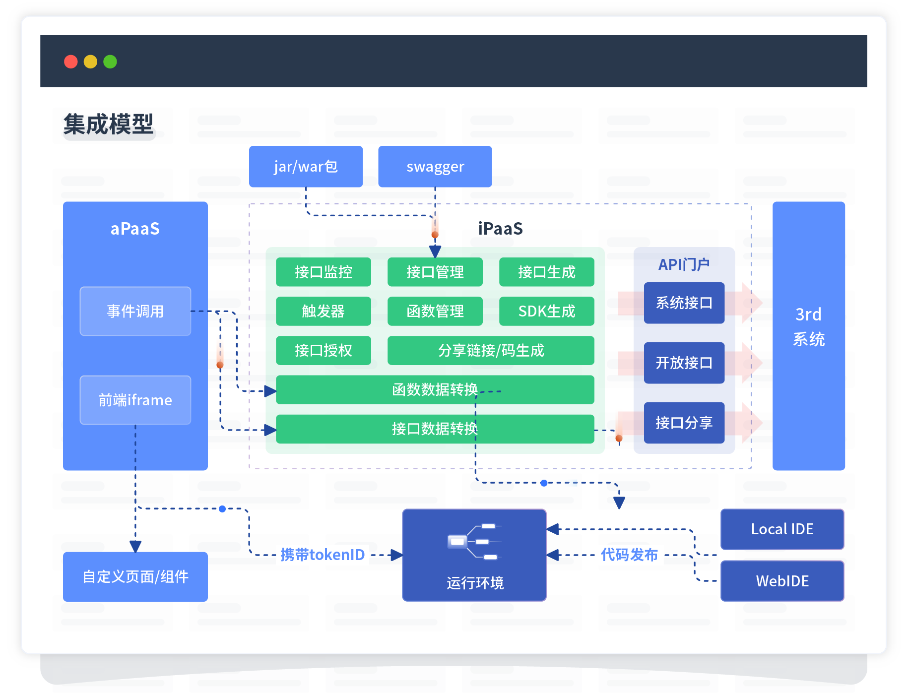 集成模型包括平台本身前、、、后端能力的扩展,,也支持通过API门户和第三方系统进行交互。。。