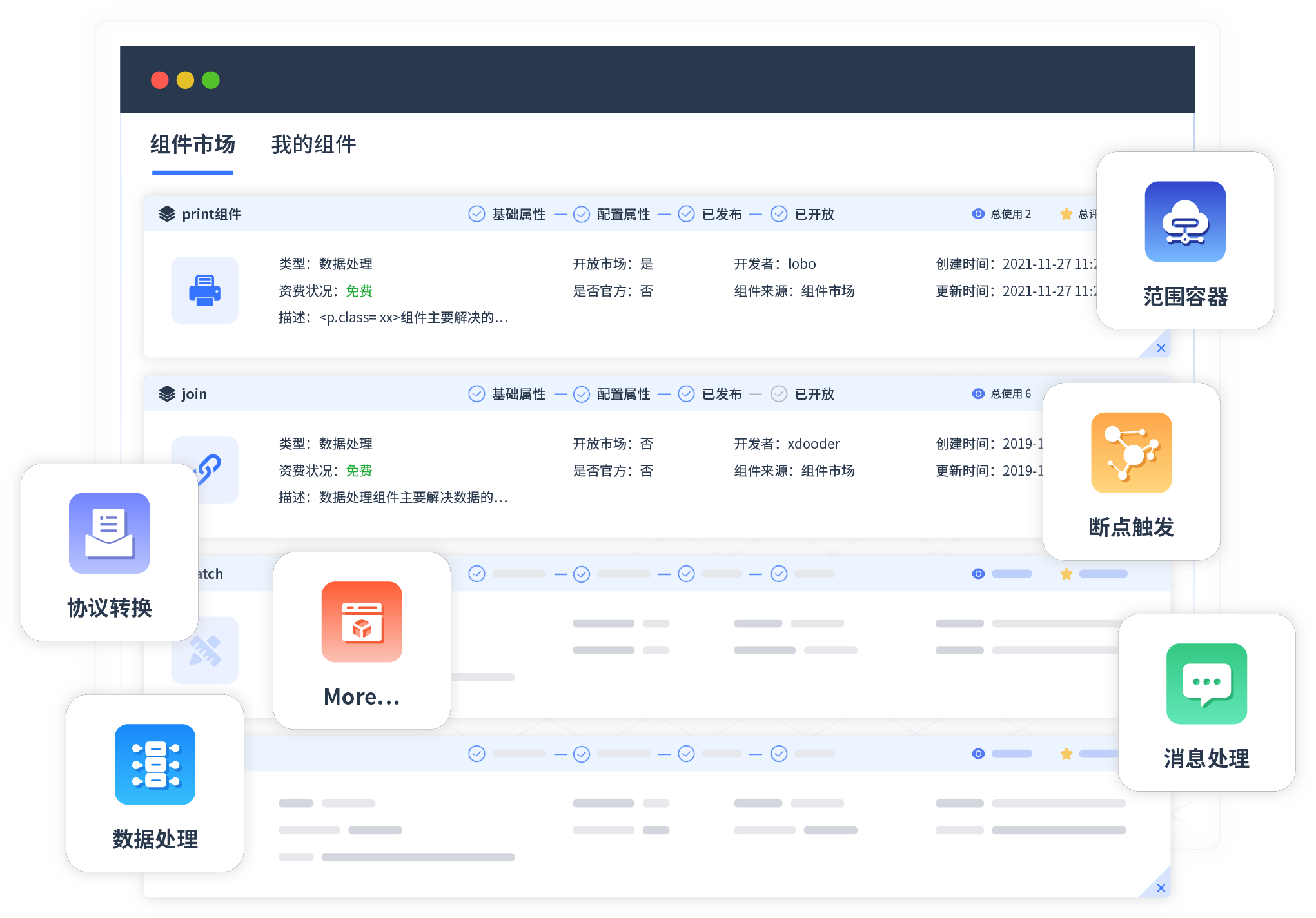 针对集成场景,,,,美团钱包商家版提供组件市场,,,例如协议转换、、消息处理、、文件操作等。。。。除平台提供的组件外,,,,客户可以自定义所需组件。。。。