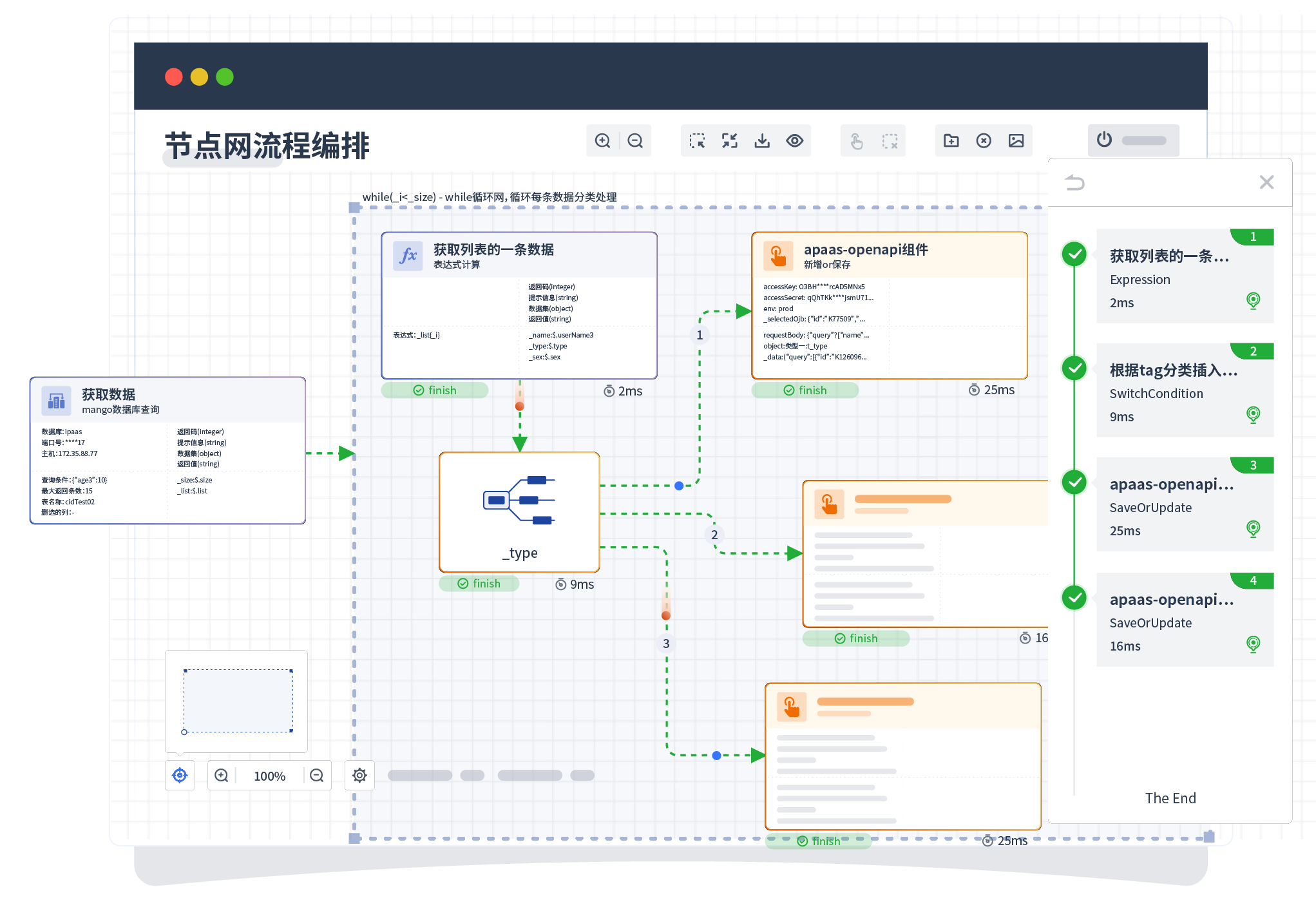 针对集成场景,,,,组件定义后支持进行流程编制,,,,不同于传统代码方式,,,,通过图形化展示,,,支持在线调试、、、、日志查看和运行回放。。